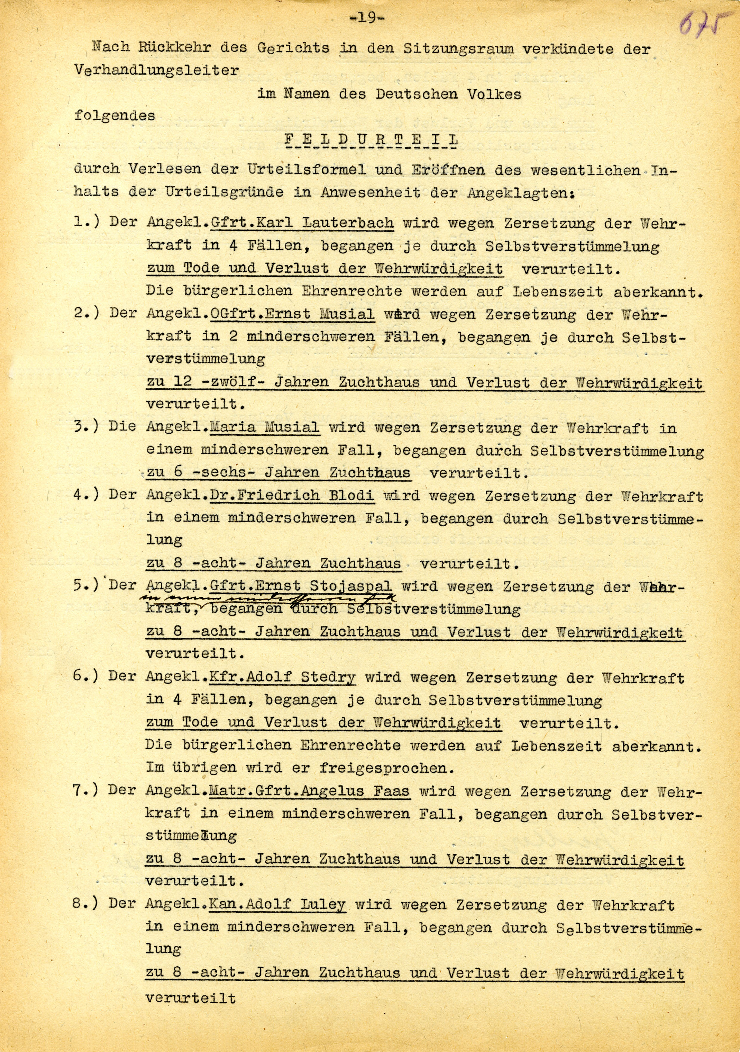 Vor meinem Urlaubsende ging ich dann zu Lauterbach und fragte ihn, ob er mir den Arm brechen will. Weil sich dies verzögerte, ging ich am Vortage meiner Abfahrt zu Lauterbach, den ich aber aus einem Kino holen musste und er brach mir den Arm durch Daraufspringen. Dies geschah in seiner Wohnung. Nachher ging ich zum Standortarzt bei dem ich angab, ich wäre auf der Stiege gestürzt.«