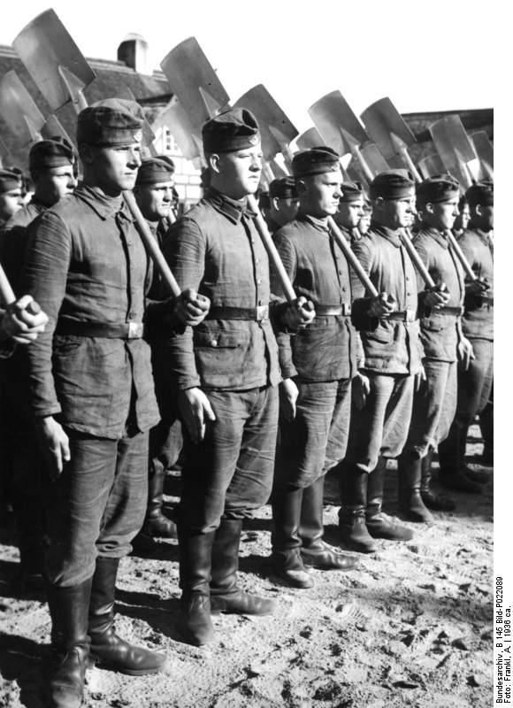 Und wenn sie dort zwei Jahre oder anderthalb Jahre sind und noch nicht ganze Nationalsozialisten geworden sein sollten, dann kommen sie in den Arbeitsdienst und werden dort wieder sechs und sieben Monate geschliffen, alles mit einem Symbol, dem deutschen Spaten.
