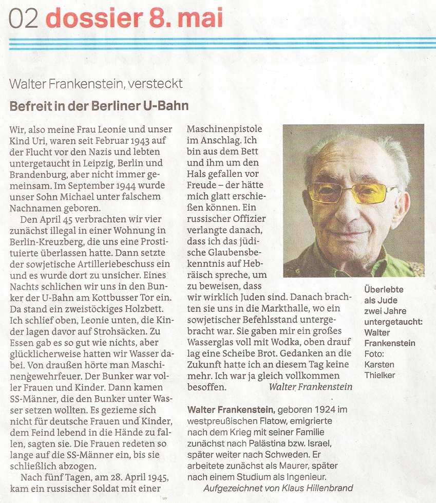 Im April 1945 suchten Walter und seine Familie während der Häuserkämpfe in den Straßen Berlins Schutz im U-Bahnhof Kottbusser Tor, gemeinsam mit vielen anderen Berliner/-innen. Dieser Zeitungsartikel erschien im Mai 2020 zum 75. Jahrestag des Kriegsendes. Hier erzählt Walter über die Stunden der Befreiung, nachdem er sich fast 26 Monate lang verstecken musste.